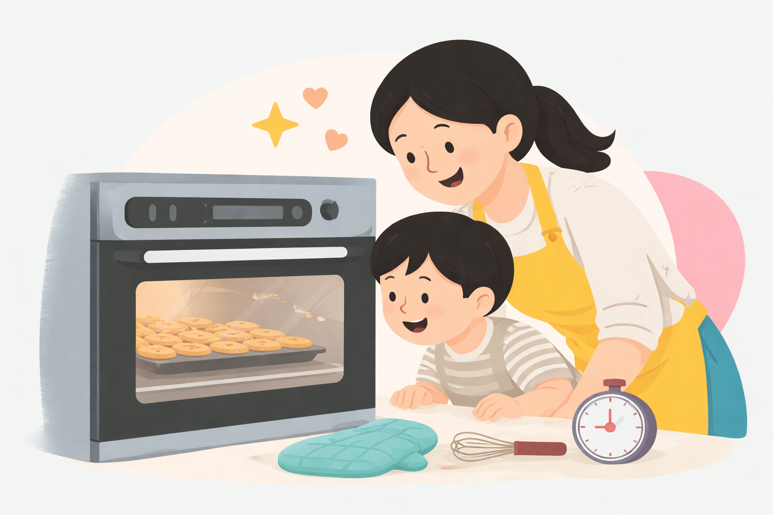 You and your child work on the same bake, side by side. No separate tasks. No sitting out.